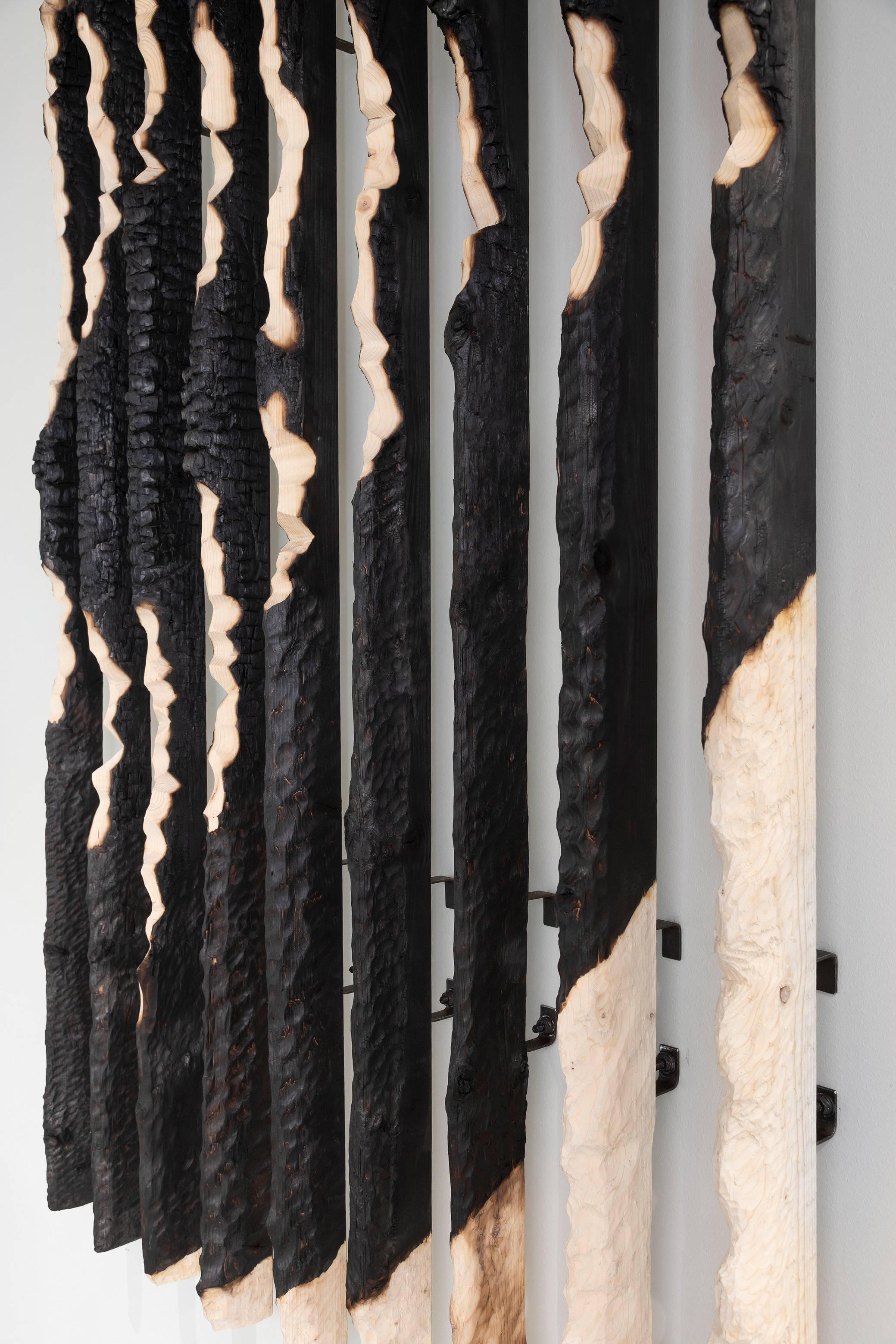 The artists have processed charred logs and explored the contrast between the burnt and white wood surfaces. Parts of the log have been preserved in their original burnt form from a fire, while other parts have been processed using various wood carving techniques and the Japanese technique shou sugi ban, which continues the burnt expression. Hard and soft surfaces move into each other, where the nine logs together form a holistic image. With raw pine, trimmed, with charred parts in a fragile, dark burnt surface, still smelling of fire, the artists appeal to something ancient in us and our Nordic history through several of the senses.